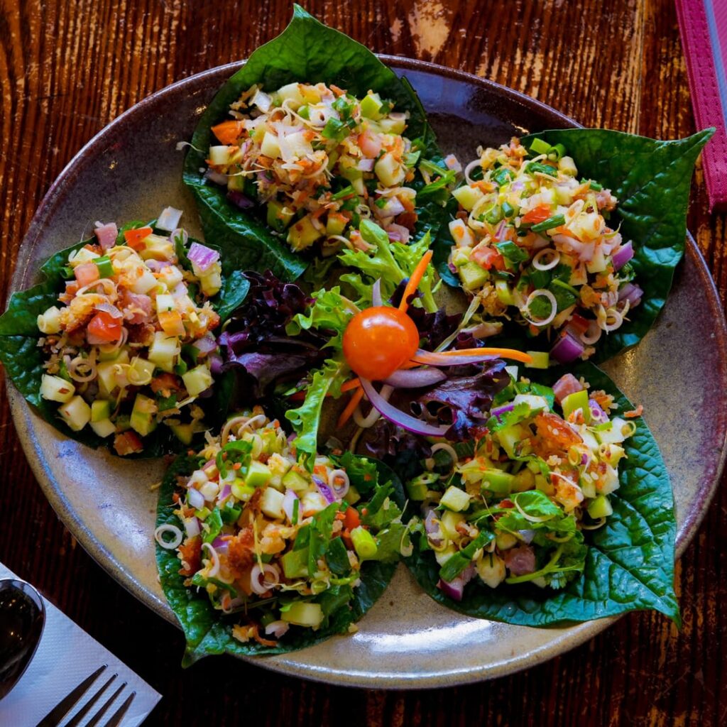 Betel leaf with lime, ginger, tomato, crunchy rice, finely chopped dried shrimps and crab meat, cured pork, chili and peanuts.