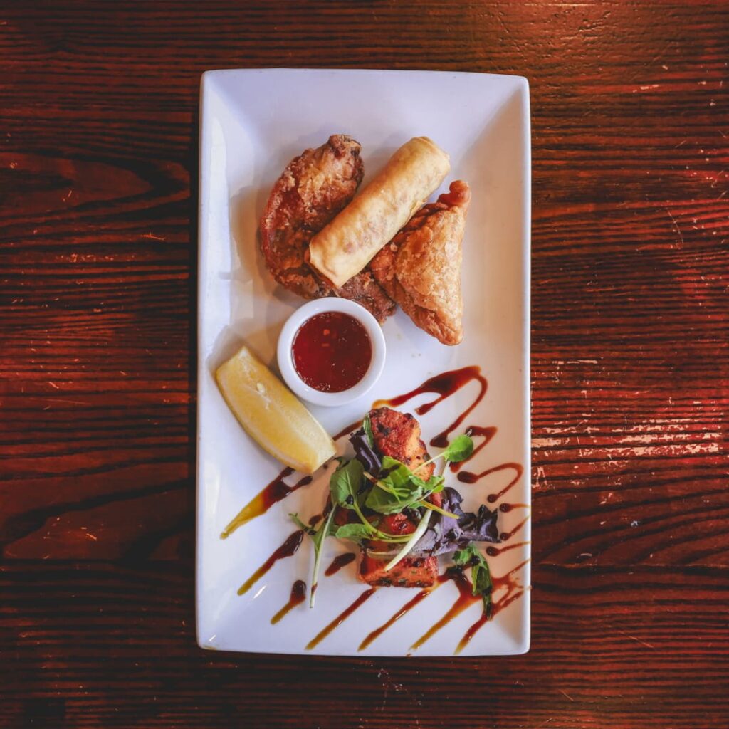 Fried vegetable puff pastry parcels. Frilled with potatoes, peas, carrots, corn and onions. Served with sweet chili sauce.