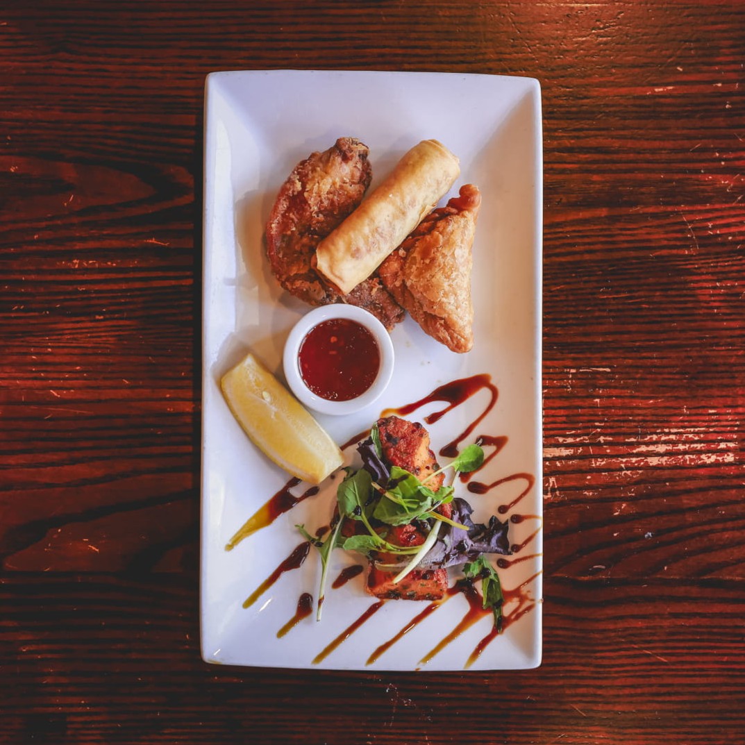 One serving of spring roll, chicken wing, fish cake and curry puff. Served with sweet chili sauce.