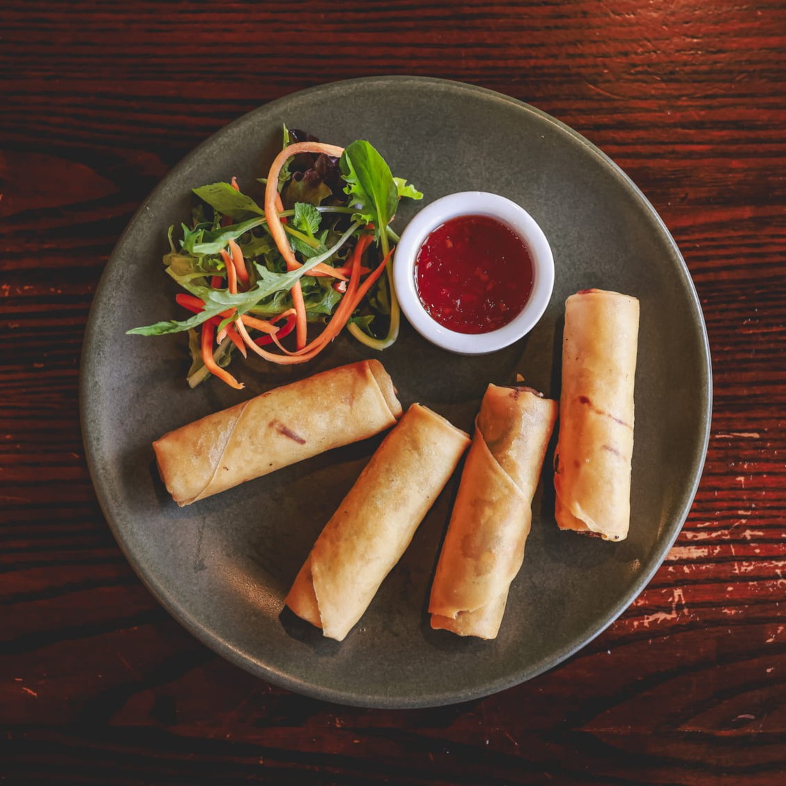 Crispy vegetable spring rolls lightly seasoned. Filled with carrots, mushrooms, onions and vermicelli noodles. Served with sweet chili sauce.