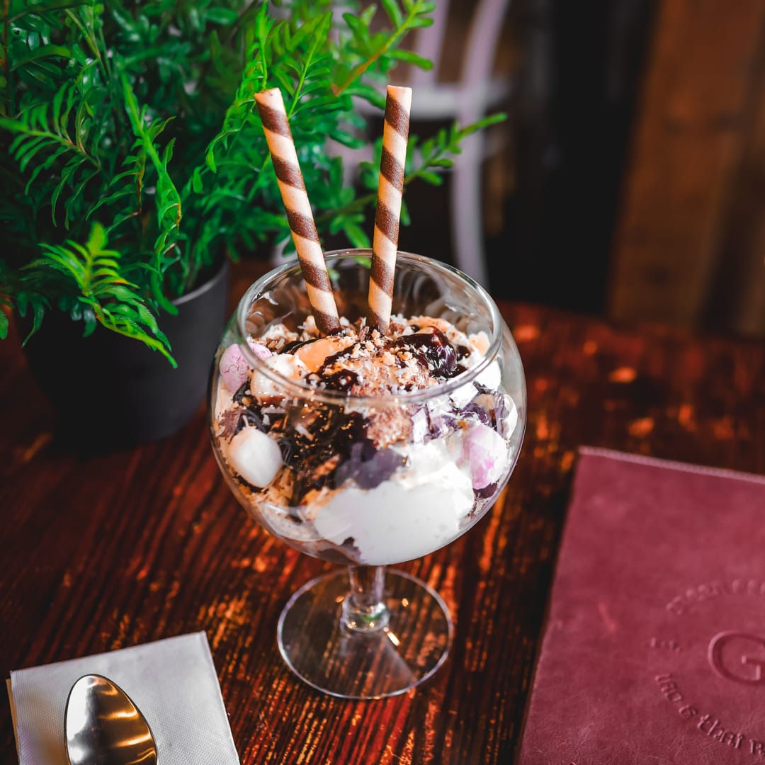 Hazelnut & Pistachio ice cream, with caramel fudge, almonds, whipped cream, chocolate, honey comb, and maple syrup.