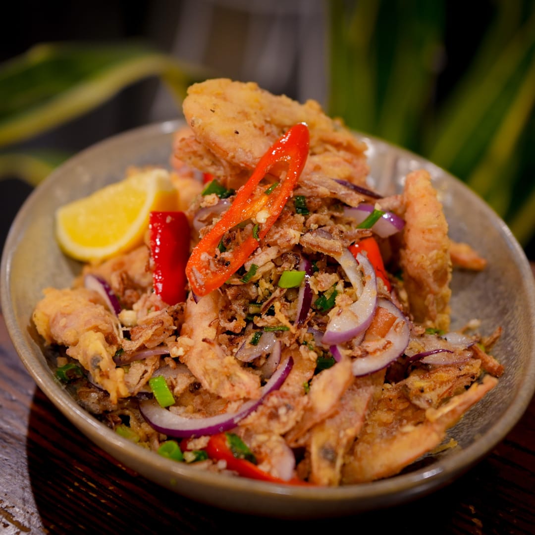 Lightly battered deep fried crispy prawns seasoned with salt and pepper, chili, shallots served with a flavor sweet, sour and spicy sauce.